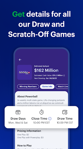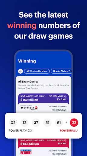 The Official NY Lottery app helps players check winning numbers, scan tickets to see if they’re winners, set jackpot notifications, browse draw and Scratch-Off game info, and find nearby retailers. It emphasizes real-time results, alerts, and an account-based experience for scanning and promotions.