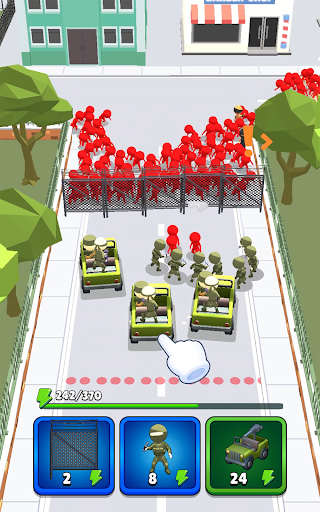 Arcade-style crowd-defense where you draw lines, deploy police units, upgrade forces, and fend off waves of protesters/zombies with occasional boss-style encounters and unit variety (infantry, armor, artillery, air support).