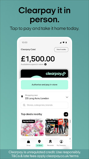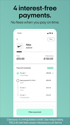 Clearpay lets UK shoppers split purchases into four interest-free fortnightly instalments when paid on time, manage orders and repayments in one place, pay early, adjust future payment dates (except first/last), receive reminders, and pay in-store by adding a Clearpay card to their mobile wallet. It aggregates hundreds of retailers with shopping inspiration and order tracking.