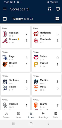 Clean, easy navigation; ability to favorite multiple teams; reliable live scores and player/game info; smooth live game access via the TV icon; granular control over push notifications.