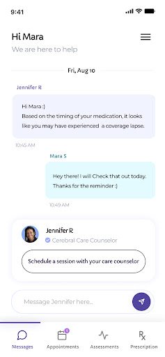 Cerebral - Mental Health centralizes tele-mental-health care with licensed clinicians, letting you complete an assessment, choose a plan and provider, schedule video/phone visits, message your care team, track medication refills when prescribed, monitor progress, and access mindfulness/CBT exercises—all in one app.