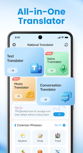 National Translator is a free, ad-supported translation tool offering text, voice-to-text, bilingual voice dialogue, and photo OCR translation, plus a phrasebook and daily quotes. It emphasizes ease of use, broad language support, and quick, on-the-go speech recognition.