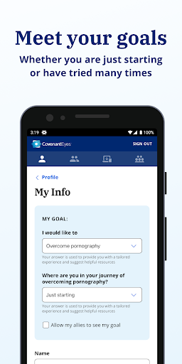 Victory Shield (by Covenant Eyes) pairs with a Victory account to help users quit porn through accountability and protection. Core features include Screen Accountability (encrypted device screenshots shared with a trusted ally), device-wide porn blocking with custom allow/block lists, optional SafeSearch and YouTube Restricted Mode enforcement, and activity monitoring that supports check-ins and reports through the companion Victory app.