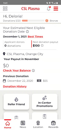 A free donor companion app for CSL Plasma that streamlines the donation journey: preview payouts, find nearby centers with wait times, set calendar reminders, complete the pre-donation health questionnaire, track donation history and iGive Rewards points, access FAQs and promotions, and chat with support.
