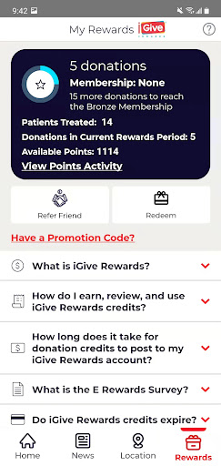 Smooth experience for many long-time donors; convenient pre-screening replaces kiosk use; reliable reward/points tracking that can be redeemed to the donor card; calendar integration and payout previews help with planning.