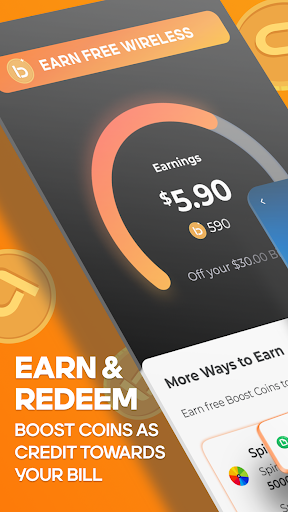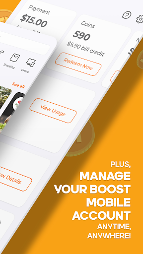 BoostOne (Boost Mobile) centralizes account management with payments, usage tracking, plan details, device shopping, and support. Distinctively, it adds Boostcoin gamified rewards (daily logins, videos, spins, offers) that can be redeemed for bill credits, plus nationwide coupons and deals.