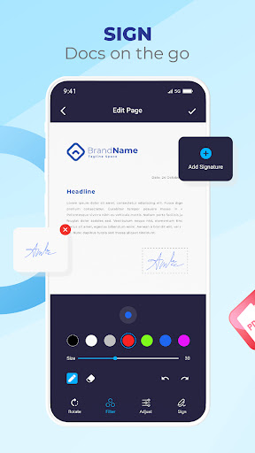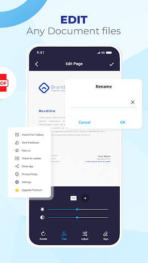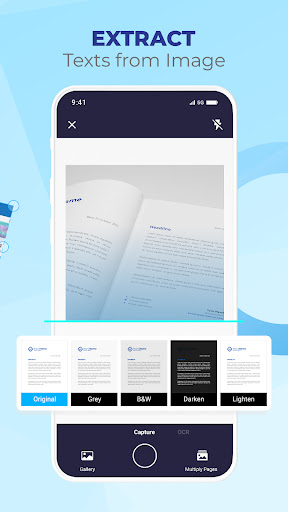 DS Camera Scanner & Photo turns your phone into a document scanner with edge detection, image enhancement, multi-mode (color/B&W/grayscale) scanning, PDF creation, OCR (image-to-text), a built-in PDF reader, and basic editing tools like crop, rotate, contrast, and e-signatures.