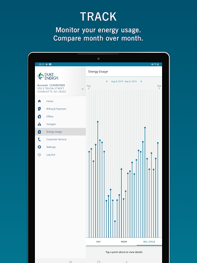 A utility account companion for Duke Energy customers that enables secure sign-in, bill viewing and payments (including autopay), outage reporting with restoration updates, daily-to-monthly usage tracking, bill reminders, and access to savings offers and customer support.