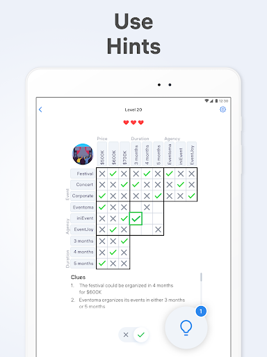 Logic Puzzles – Brain Riddles delivers a refined take on classic logic-grid gameplay, wrapping fair, clue-driven deduction in varied, story-based packs and daily challenges. The learning curve is friendly, the instructions are clear, and progress tracking keeps you engaged over time. While the ad load and a lives system can interrupt flow—and the absence of dark mode is felt by night players—the core puzzle design is strong and generous for free users. If you enjoy methodical deduction and themed logic stories, this is an easy recommendation; consider paying to remove ads for a smoother, premium-feeling experience.