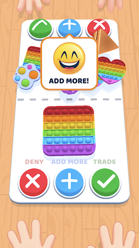 Fidget Toys Trading: Pop It 3D is a casual, offline-friendly fidget-trading simulator where you barter virtual pop-its, dimples, and squishies against an AI opponent, earn coins, unlock new toys, and upgrade rooms. It doubles as a stress-relief sandbox letting you try and interact with collected fidgets between trades.