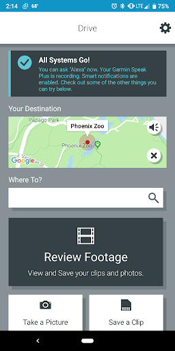 Garmin Drive™ is a companion app for compatible Garmin automotive navigators and dash cams, delivering real-time traffic, parking, advanced weather, and photoLive cameras, plus Bluetooth call/text notifications. It also offers full dash cam management (up to four cameras with Auto Sync, picture-in-picture exports) and optional Garmin Speak™ with Amazon Alexa for hands-free voice control and audio streaming.