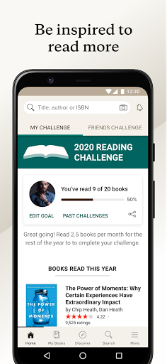 Reliable way to log books and progress (pages/percent), see friends’ shelves, discover recommendations, and read/write reviews. The cover scanner is praised for quickly adding books. Community features, author pages, and Reading Challenge motivate consistent reading.