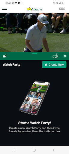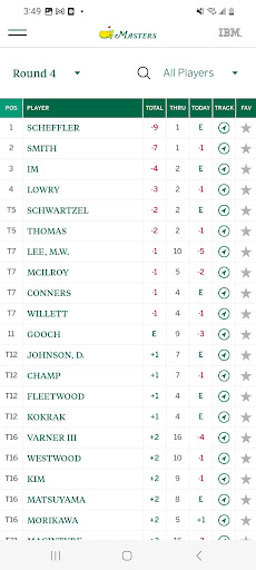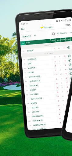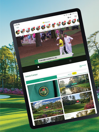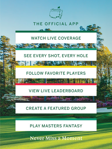 The official Masters Tournament companion for live coverage and scoring: simulcast broadcast streams, multiple featured channels (Amen Corner, Holes 4–6, 15–16, Featured Groups/Featured Groups+), personalized "My Group" feeds, Fantasy play, Every Shot Every Hole with IBM Watson commentary, interactive 3D shot tracking, PiP video, live leaderboard/mini-leaderboard, tee times, Masters Radio, news, photo/video highlights, course overviews, and Wear OS support. Live video availability is region-limited.