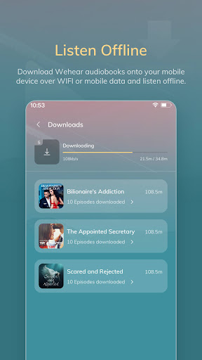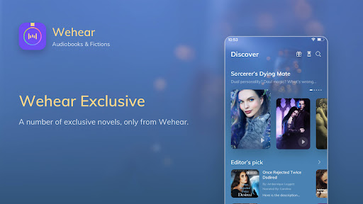 Wehear is an audiobook and serialized audio fiction app centered on romance, werewolf, fantasy, and related genres, offering professional narrators, offline downloads, playback speed control, sleep timer, cross-device sync, Wear OS support, and in-car listening via Android Auto/Automotive.