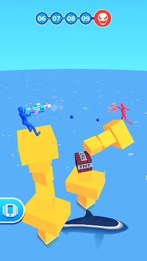 Physics-based dueling on unstable platforms where you tap to shoot, manage recoil, and try to knock opponents into the water across many short, fast levels with varying block durability and occasional multiple enemies. Collect new guns as you progress to change feel and power.
