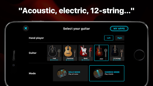 A pocket guitar simulator focused on learning through interactive games and structured lessons. It offers multiple guitar types (classical, acoustic, electric, 12‑string), left/right-handed modes, a large tabs and song library, realistic HD sound with techniques (strumming, picking, bends, arpeggios), and both lesson and free‑play modes.