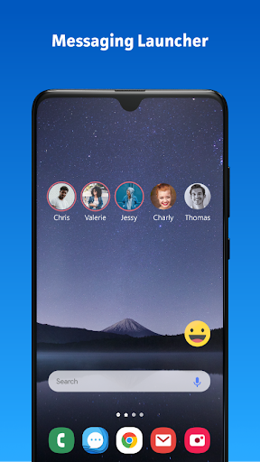 Messenger Home - SMS Launcher replaces your Android home screen with a launcher centered on messaging. It offers swipe-right access to all SMS threads, quick-launch shortcuts for five favorite contacts, customizable chat themes and colors, and a large library of 4,000+ emojis, stickers, and GIFs to enrich conversations.