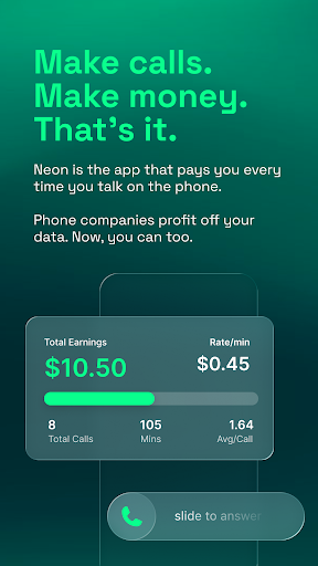 Neon pays you for time spent on voice calls with other Neon users. Core functions include per‑minute call rewards, a referral program, quick payout options, and a privacy-first approach that claims anonymization and redaction of personal info. In-app controls emphasize security (biometrics, PIN, optional 2FA), and a dashboard-style view to track balances, recent earnings, and transactions.