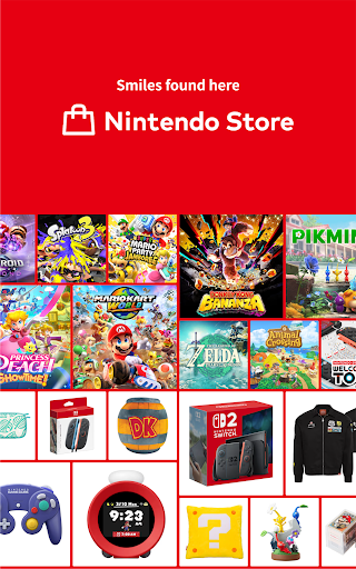 Official Nintendo shopping and info hub to browse Switch hardware, games, and merchandise, receive sale/news notifications, view play activity, manage purchases via My Nintendo Store, and check in at events.