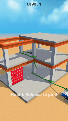 A casual demolition simulator where you attach ropes to buildings and pull them down using various vehicles, upgrading hooks/ropes and progressing through increasingly complex structures with simple, tap-and-drag controls.