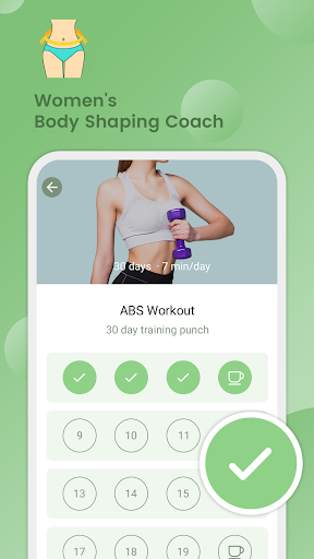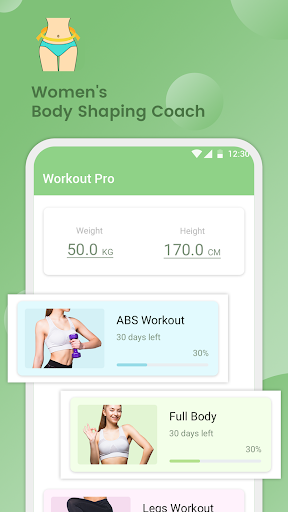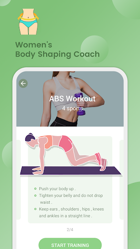 Women's Body Shaping Coach is a free fitness app focused on personalized workout plans for women, with targeted video demonstrations (abs, thighs, arms, glutes) and basic nutrition guidance including meal suggestions and food tracking.