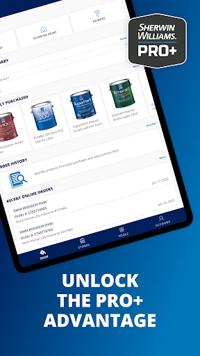 Sherwin-Williams PRO+ is an all-in-one companion for professional paint contractors to order paint/supplies with PRO+ pricing, manage accounts and invoices, create and send project bids, access business tools like product data sheets and calculators, use color selection utilities, and find stores—with options for pickup or delivery and multilingual support (EN/ES/FR).