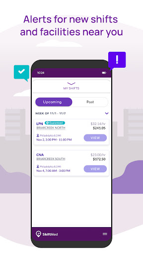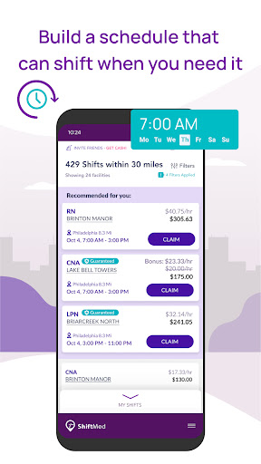 ShiftMed - Nursing Jobs connects CNAs, LPNs/LVNs, and RNs with local per diem and longer-term shifts, letting clinicians filter by pay, distance, facility, and start time. It adds perks like Guaranteed Shifts, Instant/Next Day Pay, Uber Health rides, in-app messaging, and real-time notifications to build a flexible schedule and manage clock-in/out and payroll tracking.