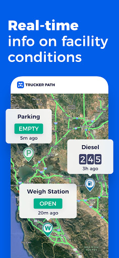 Truck-specific GPS and mapping for CDL drivers with turn-by-turn routing that avoids low bridges/restrictions, a comprehensive directory of truck stops and amenities (parking, showers, CAT scales, entrances), real-time weigh station status, crowd-sourced parking availability, and live diesel price comparisons with fuel discounts.