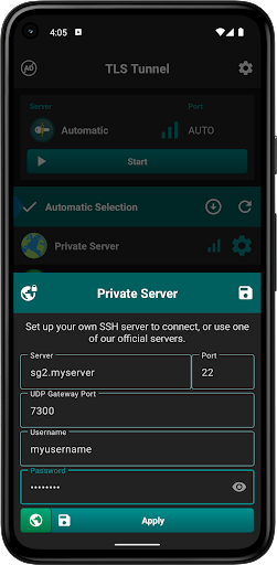 TLS Tunnel - Unlimited VPN provides free, registration‑free VPN access using a proprietary TLSVPN protocol (TLS 1.3/1.2) and optional SSH-based private servers. It aims to bypass ISP/government restrictions, encrypt traffic for privacy and anonymity, offers multiple country endpoints, and includes simple controls suitable for non-technical users. Official servers pass IPv4 traffic; SSH-based private servers are TCP-only unless paired with a UDP gateway.