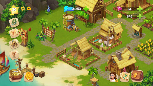 Island Hoppers: Farm Adventure (Island Questaway - Jungle Farm) blends story-driven exploration with light farming and a mix of puzzles (merge, match-3, seek-and-find). You develop a tropical homestead, clear jungle areas with energy, unlock new regions, and progress through a mystery narrative with frequent events and side activities.