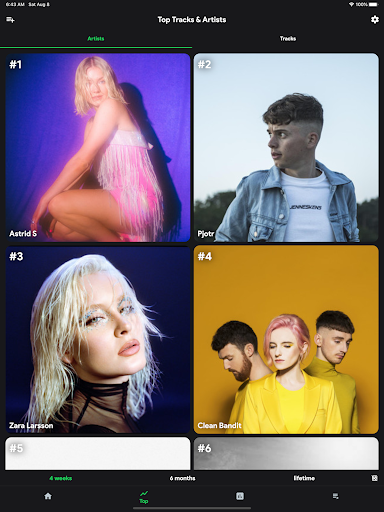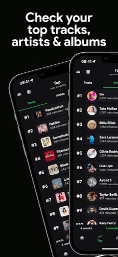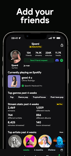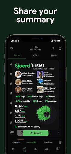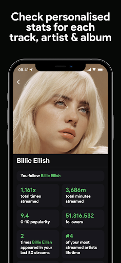 Companion app for Spotify that visualizes your listening history with real-time and historical stats for tracks, artists, albums, and genres; offers trends over custom timeframes, playcounts and minutes streamed (with Plus), listening clocks and audio characteristics, and social features to compare and discover via friends.