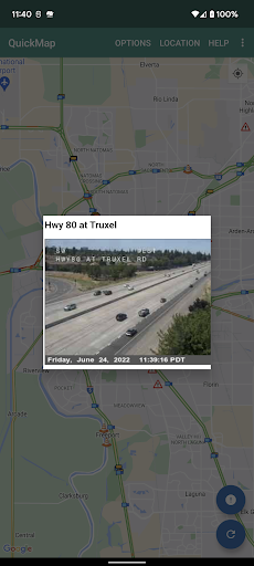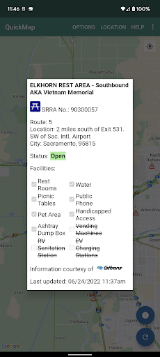 QuickMap provides an official, real-time California traffic map from Caltrans with layers for freeway speed, CHP incidents, lane closures, chain controls, live camera snapshots, changeable message signs, snowplows, rest areas, border wait times, and truck-related infrastructure. You can toggle layers, save preferences, zoom to regions, refresh data, and optionally receive geotargeted closure alerts.