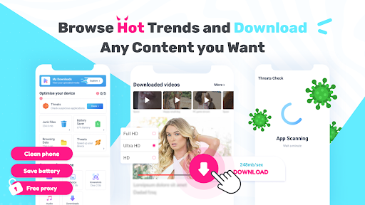 VD Browser & Video Downloader is a free Android browser with a built‑in video detector and downloader that saves clips in one tap from many websites and social networks. It supports multiple formats (MP4, 3GP, FLV, MOV, WMV, MKV), offers a simple, familiar browser UI, and adds extras like a file manager, junk cleaner, basic threat checks, and tools for anonymous browsing and accessing blocked sites.